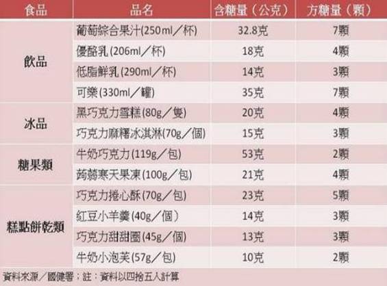 除了上述高糖量地雷飲料,其他市面常見的飲品、甜點、餅乾含糖量也不容小覷。一杯250cc的葡萄綜合果汁就相當於7顆方糖、一包70克的巧克力捲心酥就含有5顆方糖,若下午茶嘴饞不小心吃太多,糖分攝取量也容易超標。